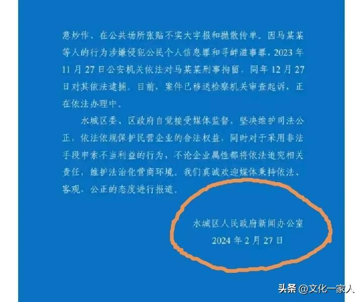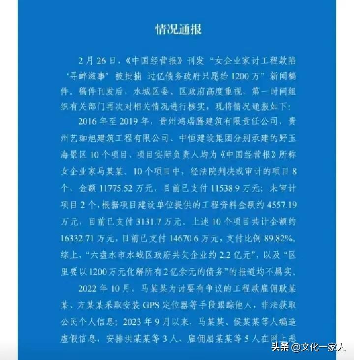 尤其是事發後,水城區政府已發《情況通報》,聲稱不存在欠款2.2億元和要以1200萬元化解債務的事情。並且支付欠款已達到89.82%。本案事實清楚,證據確鑿,現已對馬某依法逮捕。