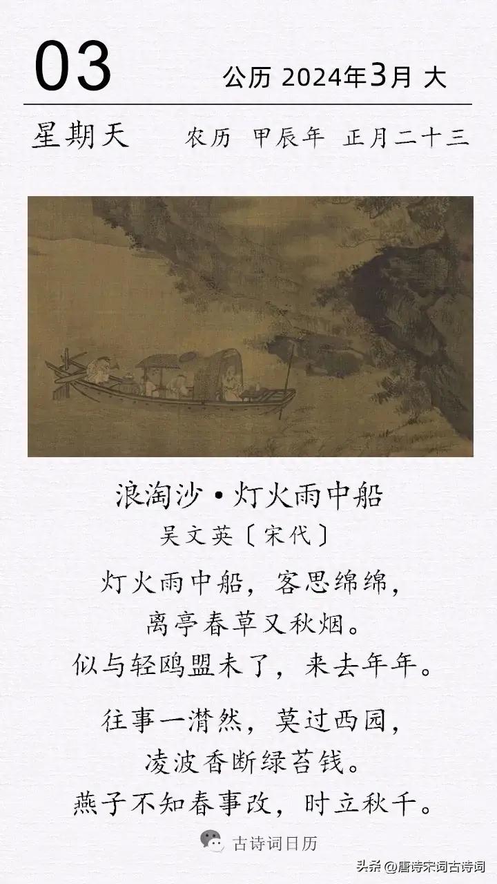 一盞燈火,一隻小船,一份思念,春草秋煙,羈旅又一年。一幅寂寥的雨夜行舟圖,躍然紙上,使人感受到行者的寂寞。“客思”二字,已點出主題,可謂全詞詞眼,亦奠定了全詞感情基調,表達了對於故園綿綿不絕的思念。