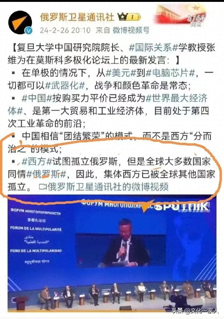 最近莫斯科有個多極化論壇,我們的張維爲教授到場作了專題發言,