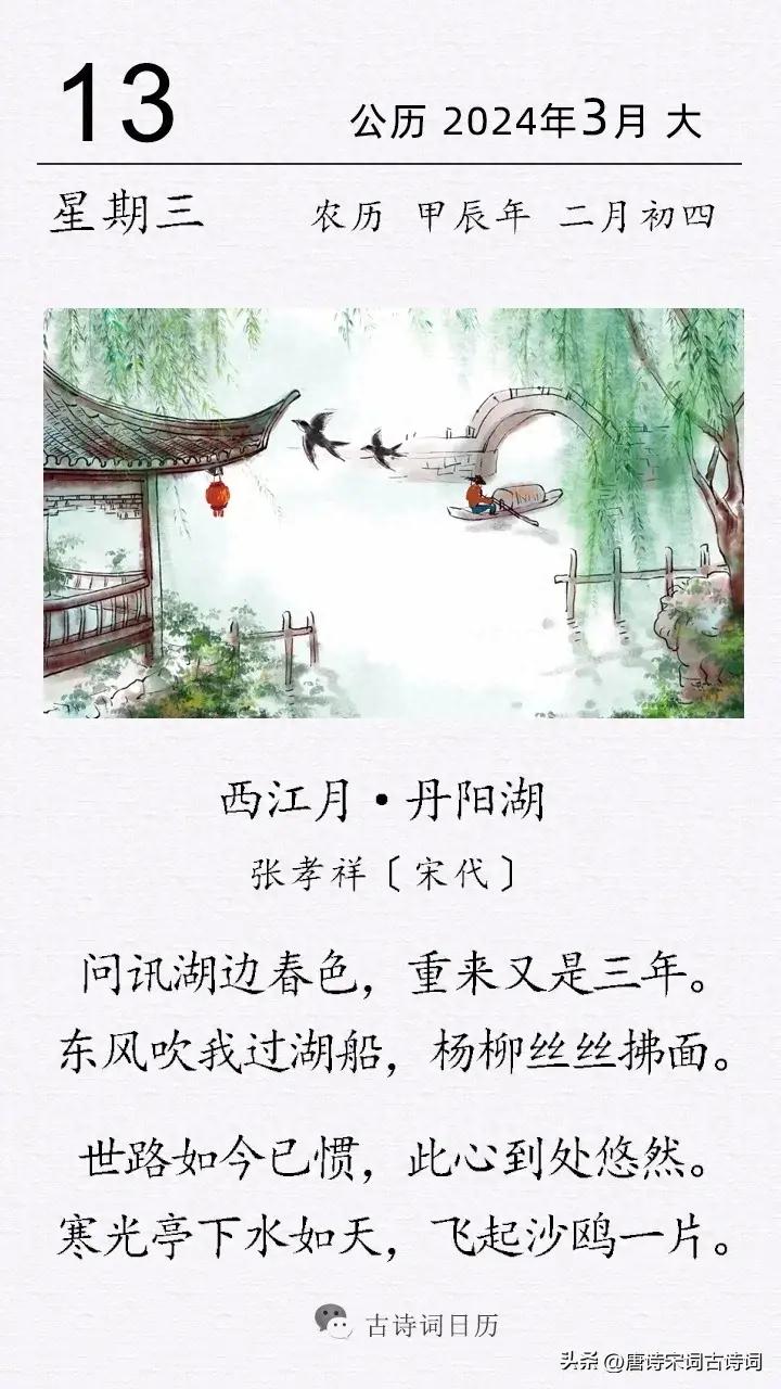 “東風吹我過湖船,楊柳絲絲拂面。”意思是說,“我”乘舟駛過湖面,春風輕輕地吹,楊柳搖曳,絲絲拂面。這是寫“丹陽湖之春色”。