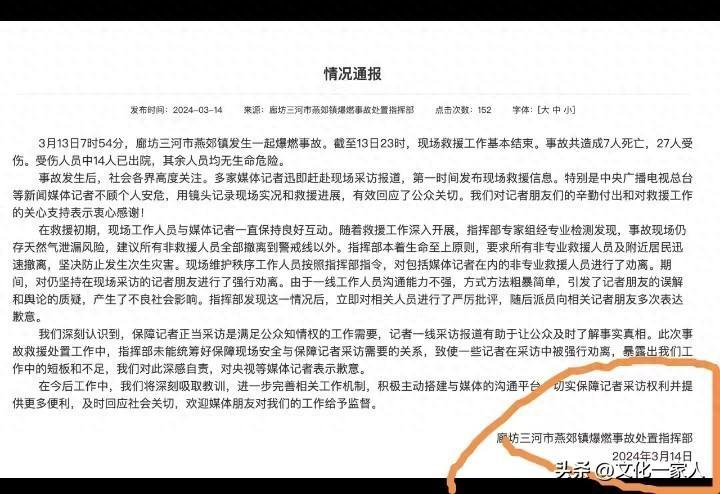 河北三河爆燃事故,由於央媒現場報道受阻,引發了較大社會輿情。