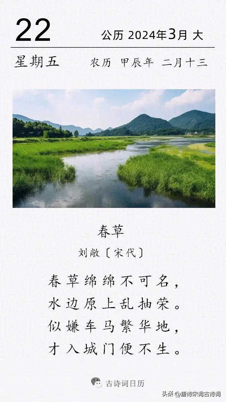 “春草綿綿不可名,水邊原上亂抽榮。” 這兩句意思是說,春草生長,綿綿不絕,不可名狀,水池邊、原野上,到處都是一派蓬勃生長的景象。這是寫“春草之蓬勃”。