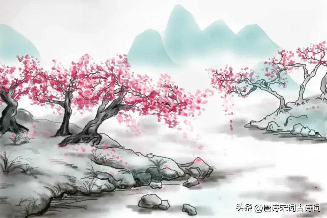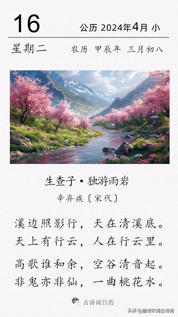 桃花水,即桃花汛。農曆二三月桃花盛開時節,冰化雨積,黃河等處水猛漲,稱爲桃花汛。題目是“獨遊雨巖”,一個人獨自遊春,內心會孤獨嗎?非也。詞人非但不孤獨,反而放聲高歌,享受一個人的靜謐自由時光。原本以爲只有自己的歌聲,不承想一邊卻有聲音來相和。這就如同李白原本是一個人飲酒,可是喝着喝着就變成了“舉杯邀明月,對飲成三人”。“高歌誰和餘”的發問,緊接着就是“空谷清音起”的回應。可是在這深山幽谷,怎麼會有相和聲呢?“非鬼亦非仙,一曲桃花水”,謎底揭開,原來是桃花汛期到了,溪水潺潺,發出了悅耳動聽的聲音。這樣,通過設置懸念,很好地引出春水,着實高妙。