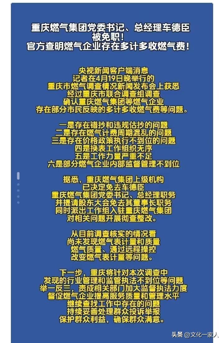 重慶聯合調查組4月19日通報,重慶燃氣確實存在多計多收燃氣費現象。