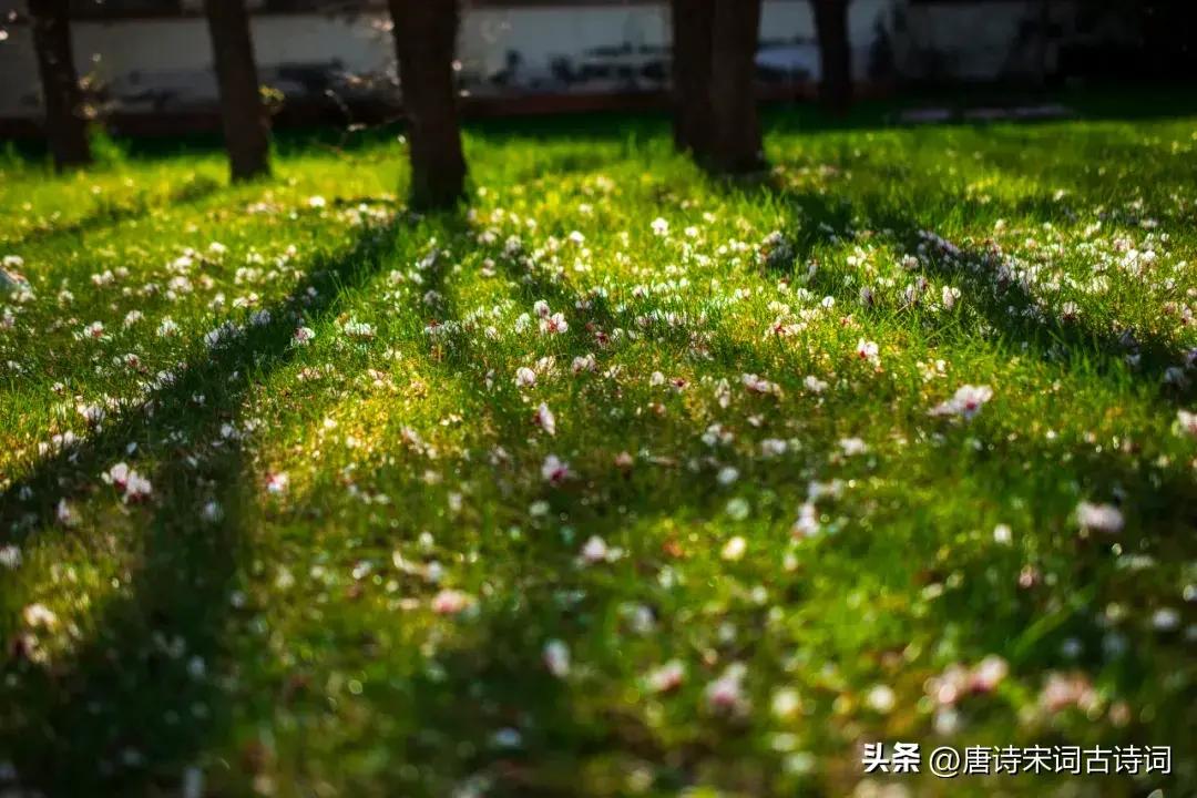 花開與花落,皆由春風開啓,皆是時光的安排。一日日,榮與枯,都是不相同的啊。這就是時光的祕密啊,花開時讓人歡喜,花落後,亦可以賞玩,何必傷感呢?看那綠苔與青草之上,點綴着殘紅片片,也是美麗奪目的春光啊。
