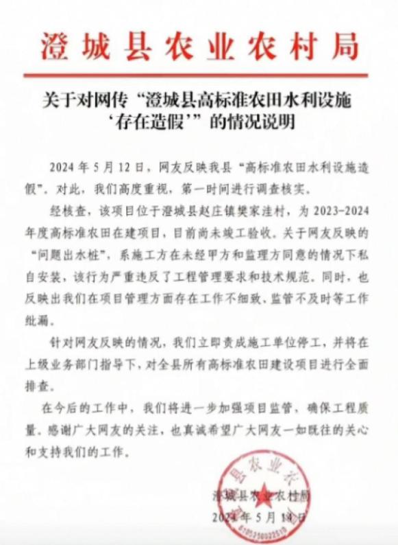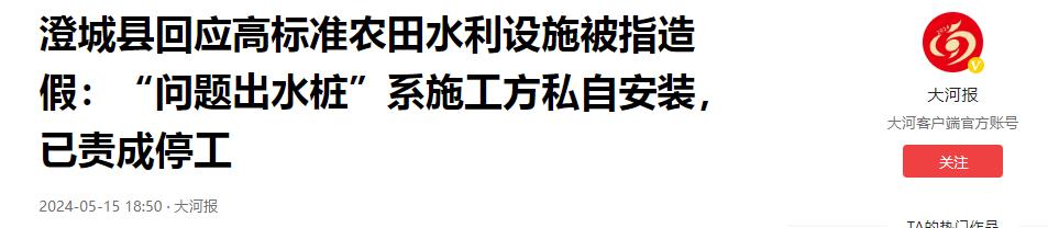 大河報《澄城縣回應高標準農田水利設施被指造假:“問題出水樁”系施工方私自安裝,已責成停工》