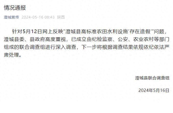 5月16日,當地媒體“澄城宣傳”官方發佈公告,針對此次“水利設施造假”一事成立聯合調查組進行深入調查。