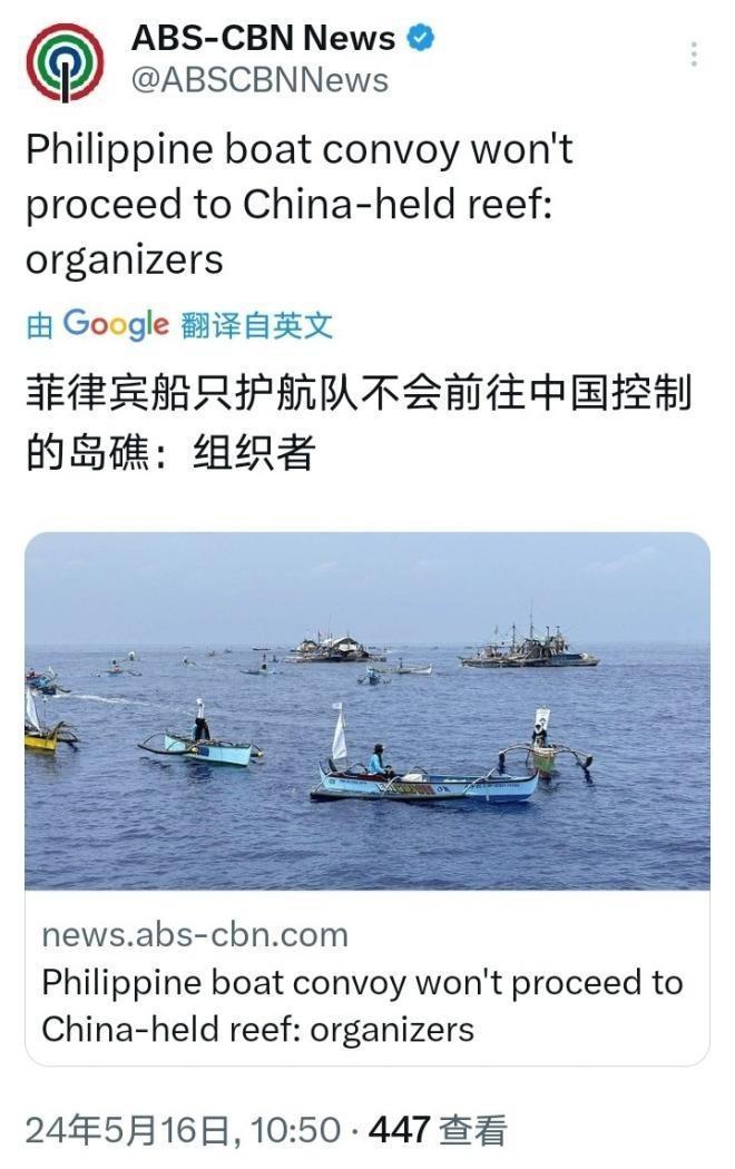 Atin Ito的領頭人在做完這些後於16日上午十點多發佈了一則動態“菲律賓船隻護航隊不會前往中國控制的島礁。”