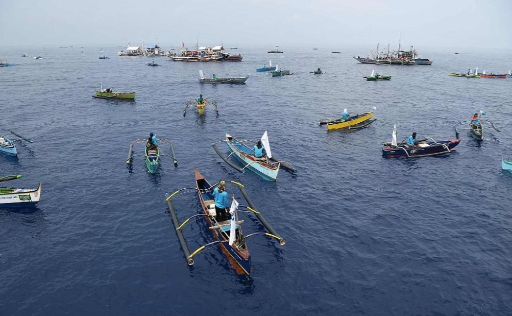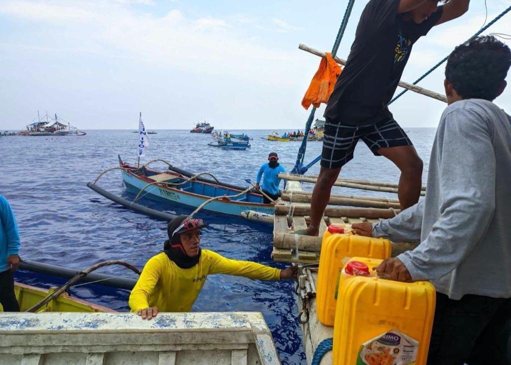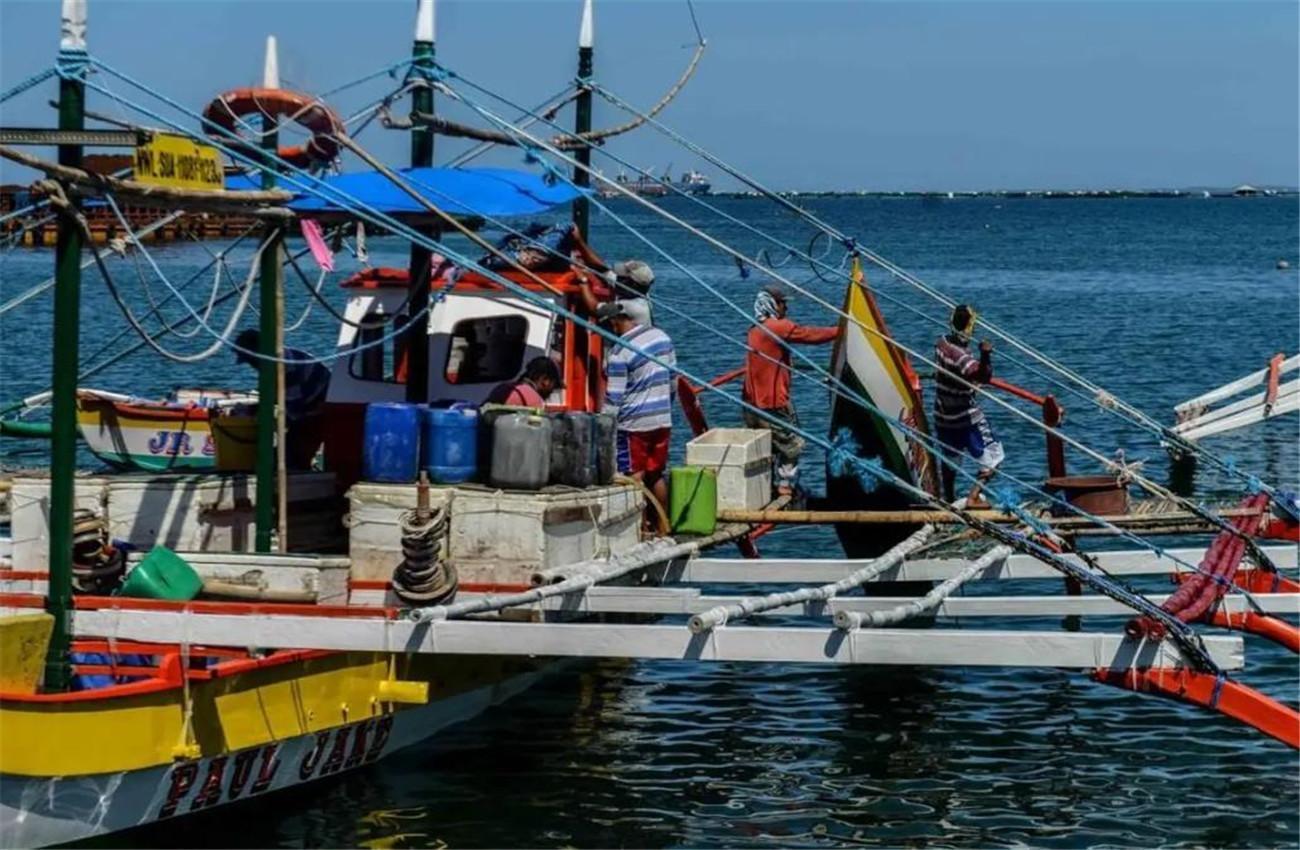 原來,菲律賓艦船給這些漁民分發了1000升柴油和兩百個食品包,領完補給的漁民們領完這些“香蕉”就散開了。