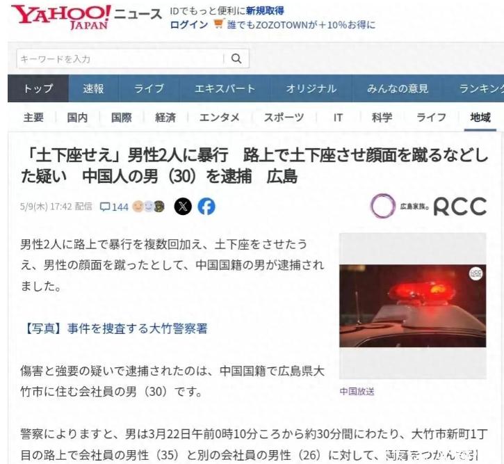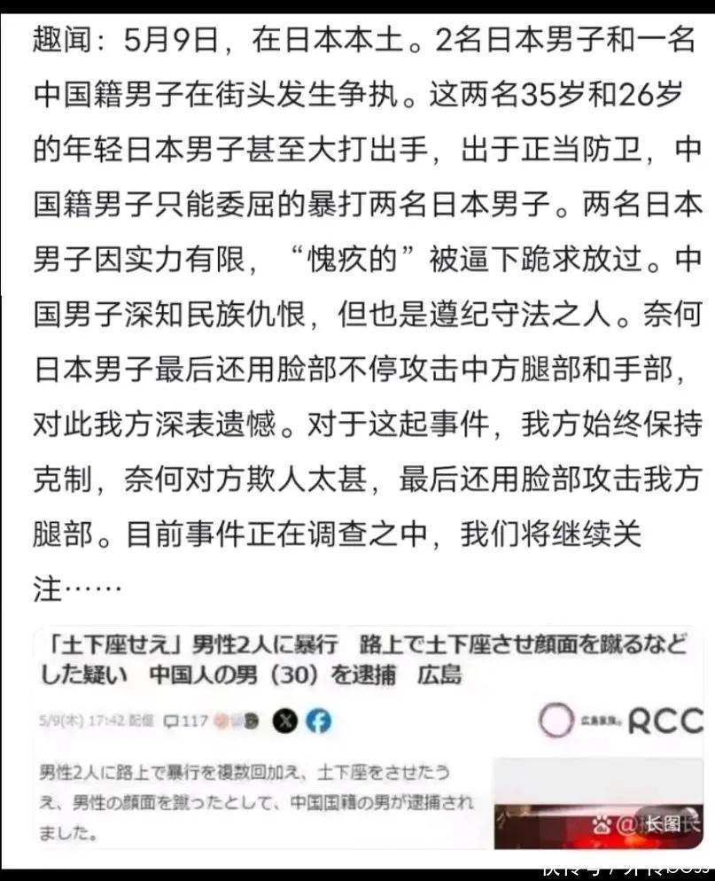 日本廣島縣電視臺官方賬號“中國放送RCC” 2024.05.09《一名中國籍男子因在路上對2名男子多次施暴致使其下跪並踢其面部在廣島被捕》