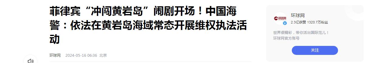 參考信源:環球網《菲律賓“衝闖黃巖島”鬧劇開場!中國海警:依法在黃巖島海域常態開展維權執法活動》