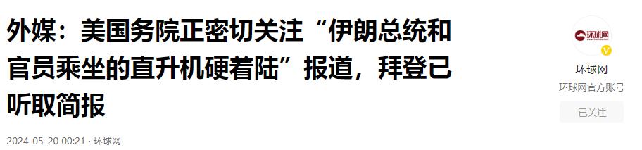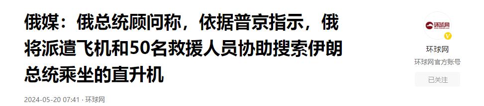 環球網《外媒:美國務院正密切關注“伊朗總統和官員乘坐的直升機硬着陸”報道,拜登已聽取簡報》;《俄媒:俄總統顧問稱,依據普京指示,俄將派遣飛機和50名救援人員協助搜索伊朗總統乘坐的直升機》