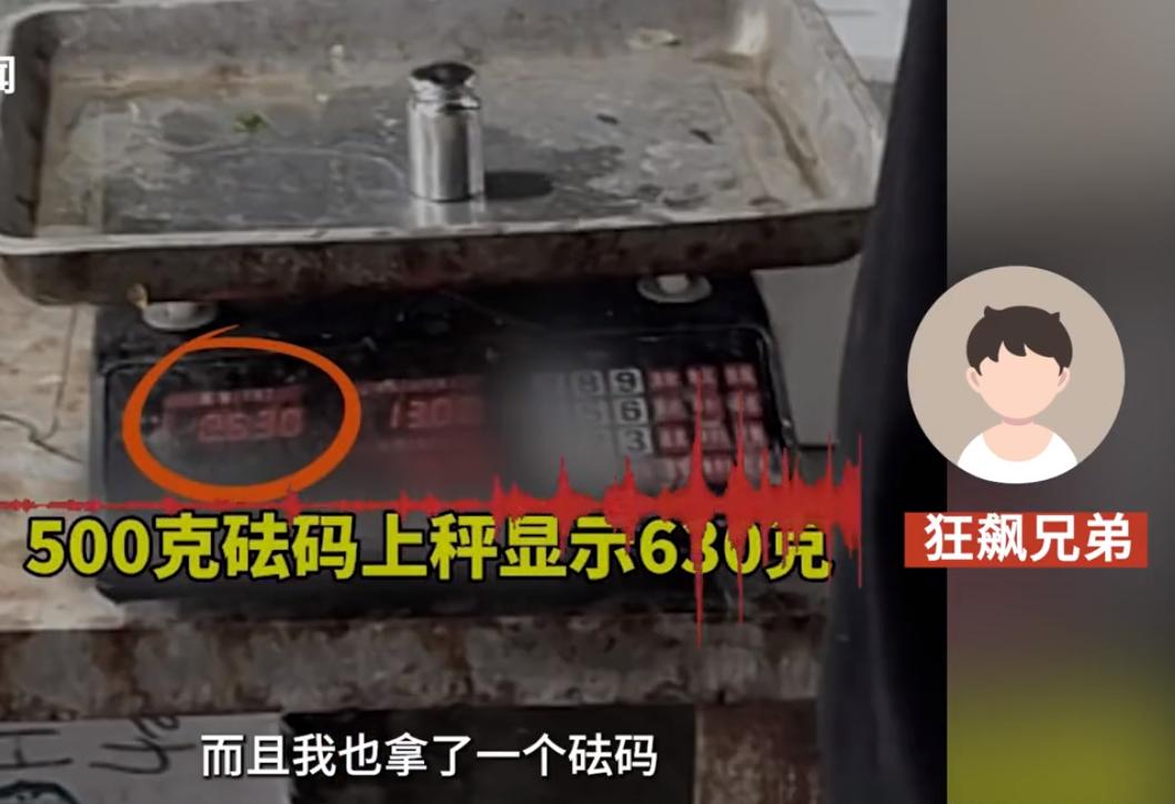 大勇和一名攝影師來到市場後,在徐某的攤位前停下,其中有款65元一斤的爬爬蝦,他買了一斤,隨後拿出了自己隨身攜帶的砝碼(500g)測試徐某攤位前的秤。