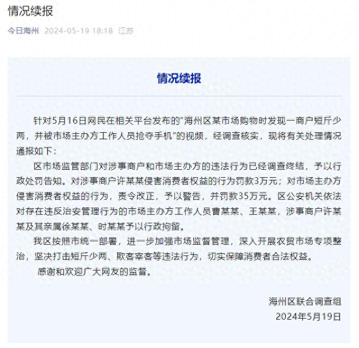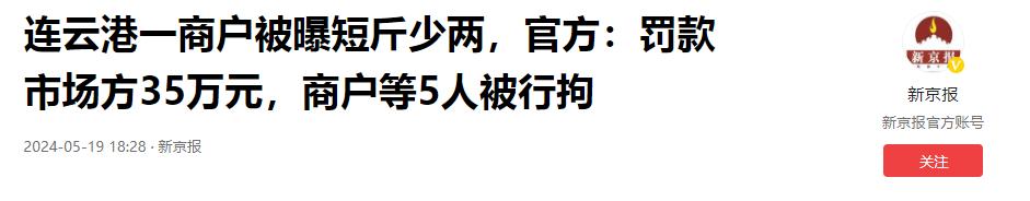 新京報《連雲港一商戶被曝短斤少兩,官方:罰款市場方35萬元,商戶等5人被行拘》