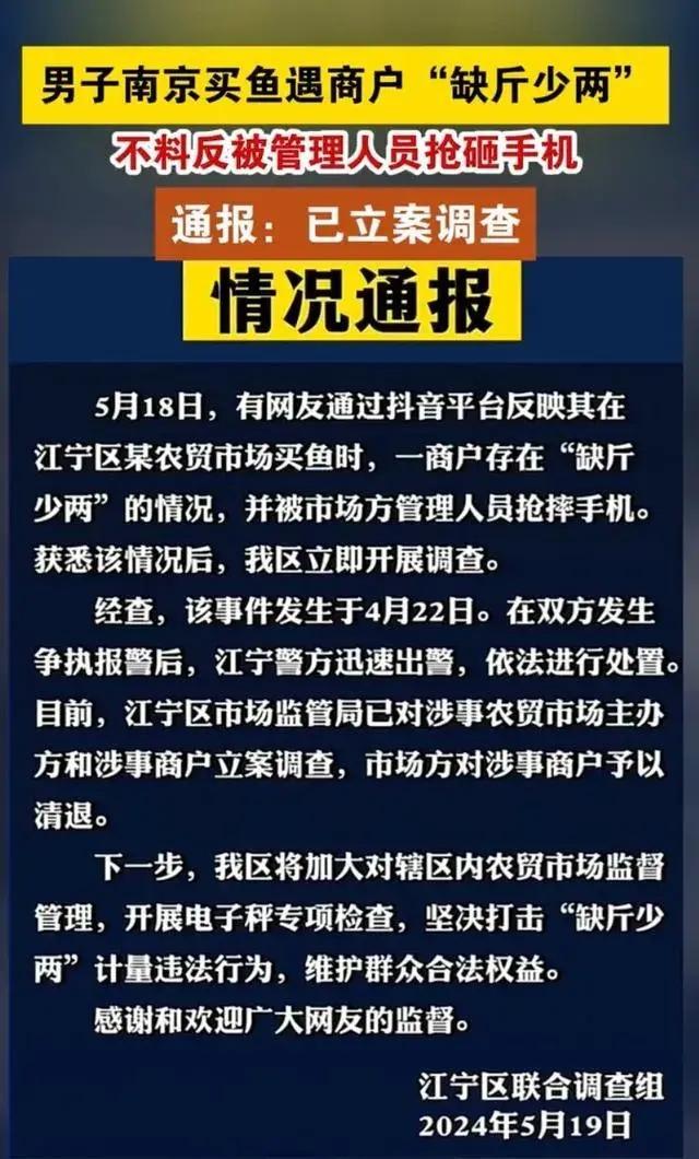 5月19日時,南京江寧區的市場監管局表示,已經立案,目前涉事的商戶已經被清退了,接下來的調查重點將會放在市場監管等“缺斤少兩”的違法行爲上。