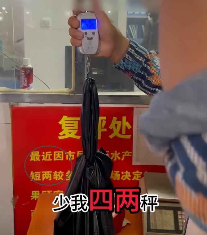 從復秤處的標牌上來看,近期因爲鬼秤事件受害的買家不在少數,博主用該處的秤復重後發現,果然賣花鰱的商戶短了四兩秤。