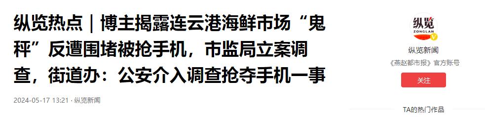 縱覽新聞《縱覽熱點|博主揭露連雲港海鮮市場“鬼秤”反遭圍堵被搶手機,市監局立案調查,街道辦:公安介入調查搶奪手機一事》