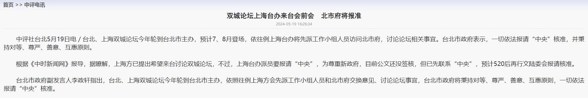 中評網《雙城論壇上海臺辦來臺會前會 北市府將報準》