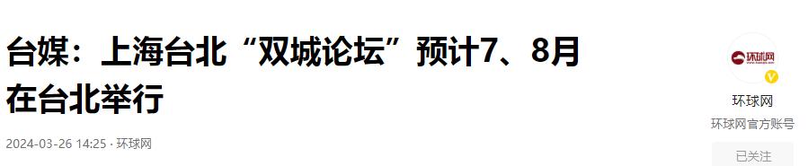 環球網《臺媒:上海臺北“雙城論壇”預計7、8月在臺北舉行》