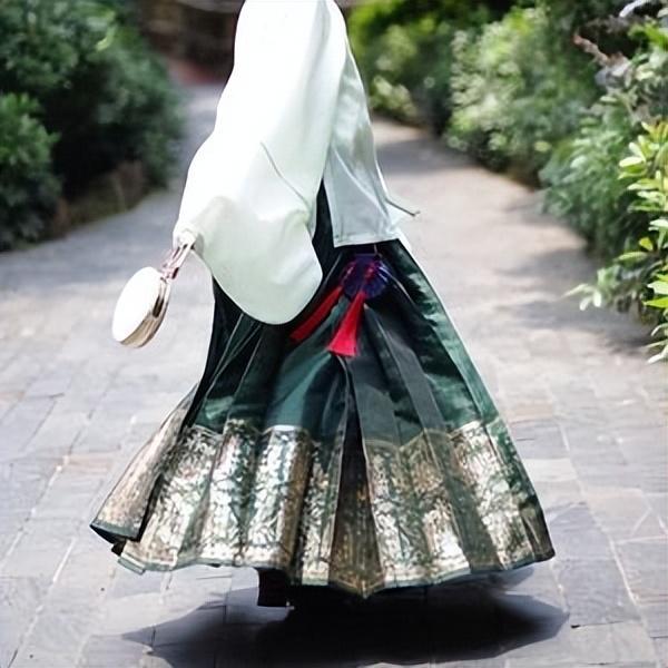 到明朝末年的時候,馬面裙已經衍生出了各種花紋、面料、工藝的裙子,因風吹動時褶皺翩翩,色彩嫺雅相間,好似月光舞動,又稱作“月華裙”。