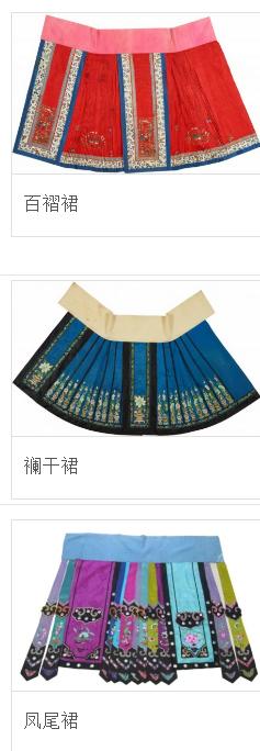 清朝的馬面裙,有百褶裙、襴幹裙、鳳尾裙,此外還有鳳尾側襉式和鳳尾襴乾式結合的新樣式。