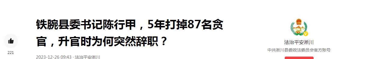 參考信源:《鐵腕縣委書記陳行甲,5年打掉87名貪官,升官時爲何突然辭職?》法治平安淅川