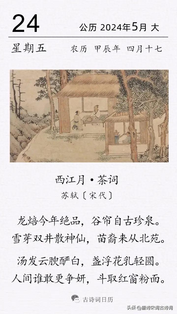 “龍焙今年絕品,谷簾自古珍泉。雪芽雙井散神仙,苗裔來從北苑。”上闋是說,今年的龍焙茶爲茶中極品,自古以來,谷簾瀑布是泉水上品。產自雙井的雪芽貢茶十分珍貴,其茶樹的始祖源於閩國北苑。