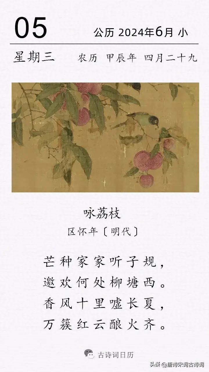 “香風十里噓長夏,萬簇紅雲釀火齊。”這兩句是說,長夏到來,十里荷花,散發陣陣香氣。遠處,萬簇紅雲,鮮豔奪目,荔枝成熟了。