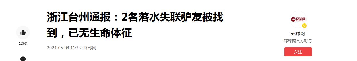 參考信源:《浙江台州通報:2名落水失聯驢友被找到,已無生命體徵》環球網