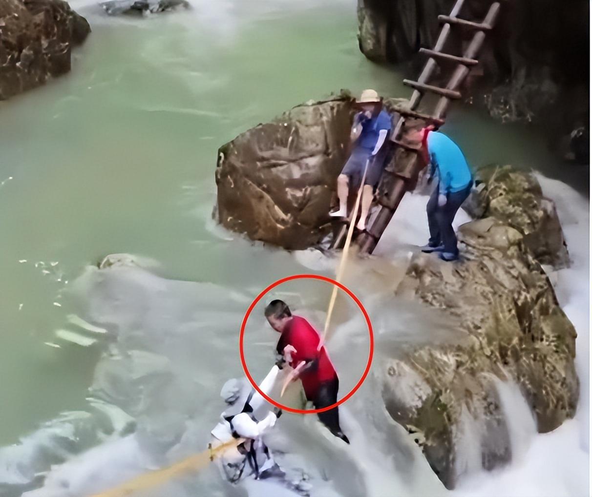 從視頻上看,紅衣男子直接從後面抱住了女子,但是繩子能夠接受的衝擊力不大,所以男女被水流衝了下去。