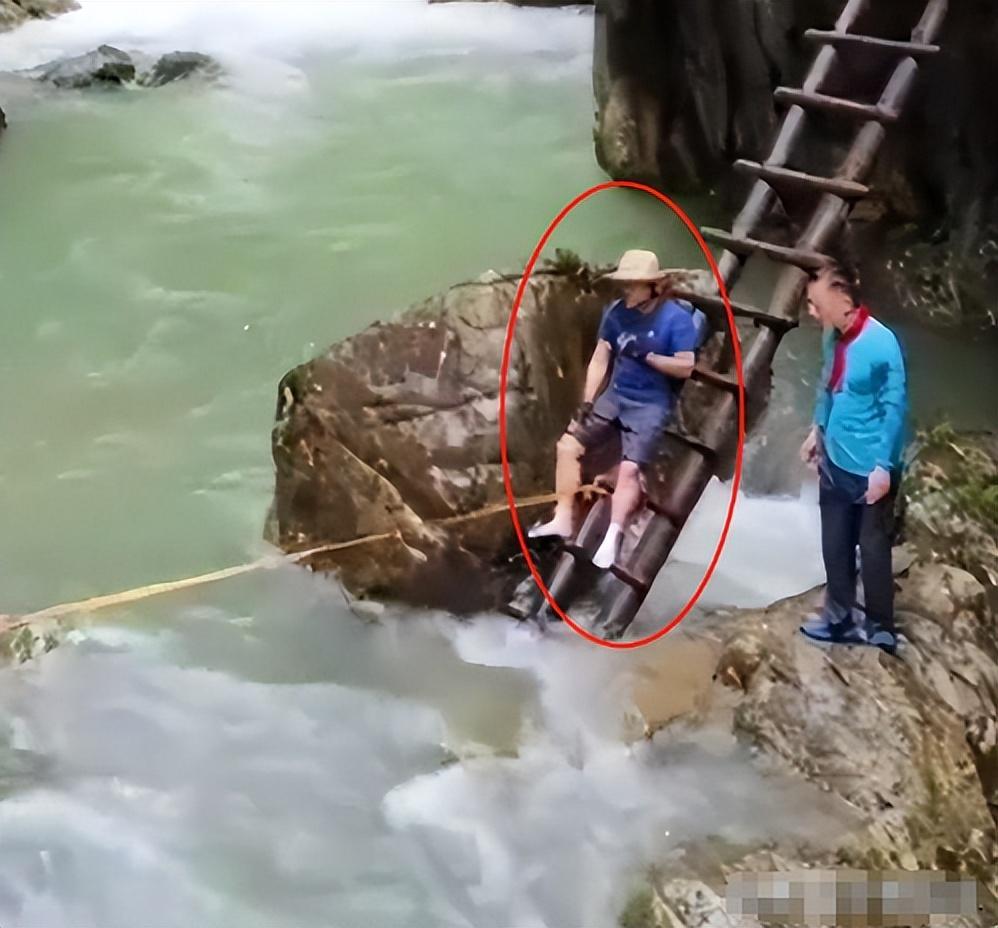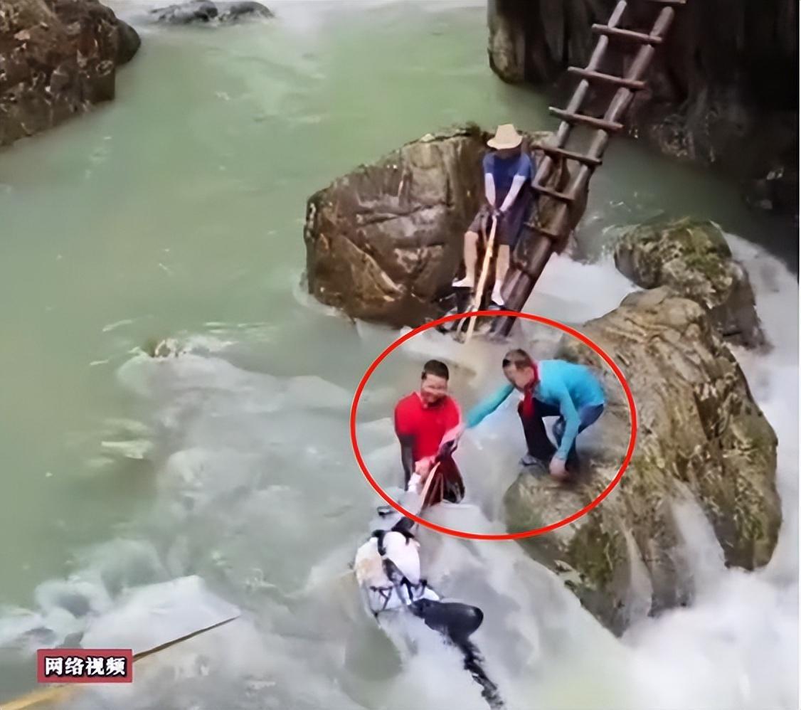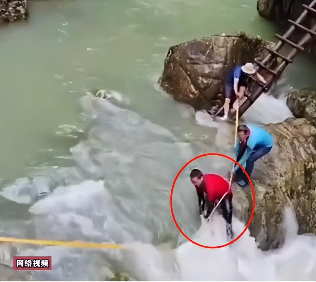 根據後續爆出的有關視頻可以看出,其中有兩名驢友一名身穿紅色衣服,一名帶着遮陽帽,他們二人中間有一根繩子,兩人站在溪流之中,其中的河水極爲湍急。