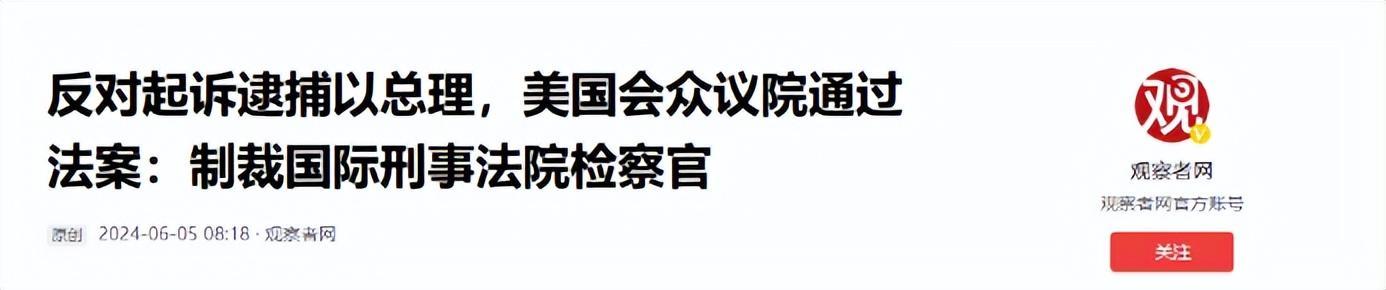 參考信源:《觀察者網,2024-06-05,《反對起訴逮捕以總理,美國會衆議院通過法案:制裁國際刑事法院檢察官》》