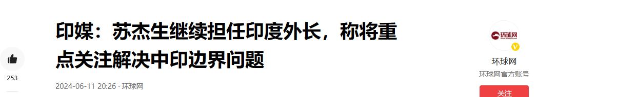 參考信源:《環球網2024-06-11 20:24 印媒:蘇傑生繼續擔任印度外長,稱將重點關注解決中印邊界問題》