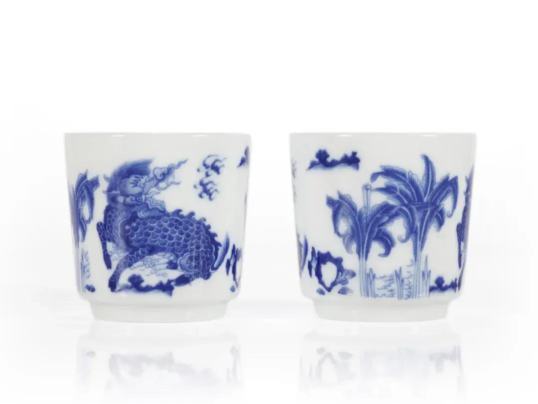 觀復博物館秉承“與古人對話,與文化同行”的創物初心,以館藏【清順治 青花麒麟紋筒瓶】爲靈感原型,取芭蕉之格調、麒麟之祥瑞,推出嘉瑞祥麟瑞獸對杯▼