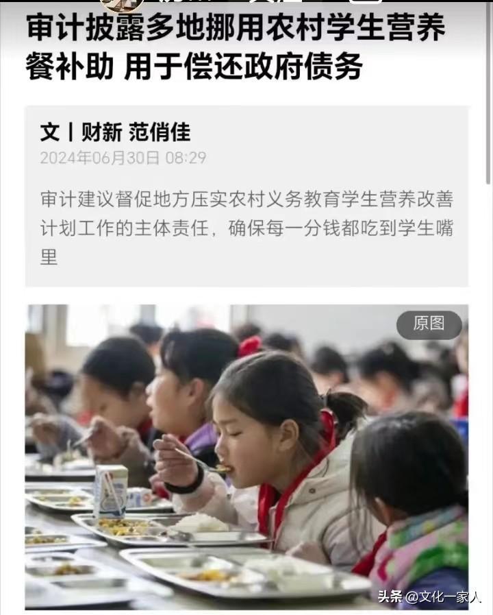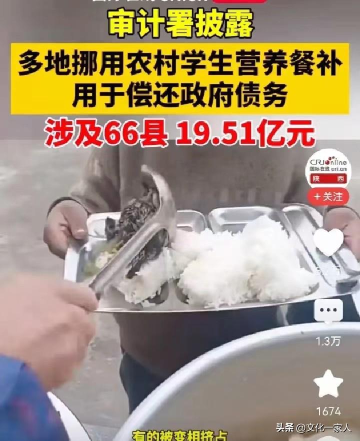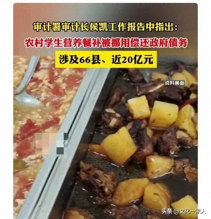 近日,國家審計署報告,在對159個縣的審計中,發現有66個縣挪用學生營養餐補資金近20億,用於償還政府債務和其它支出。