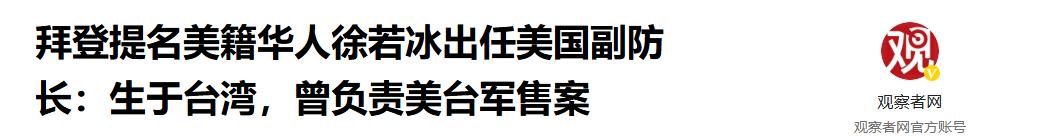 參考信源:《拜登提名美籍華人徐若冰出任美國副防長:生於臺灣,曾負責美臺軍售案》觀察者網
