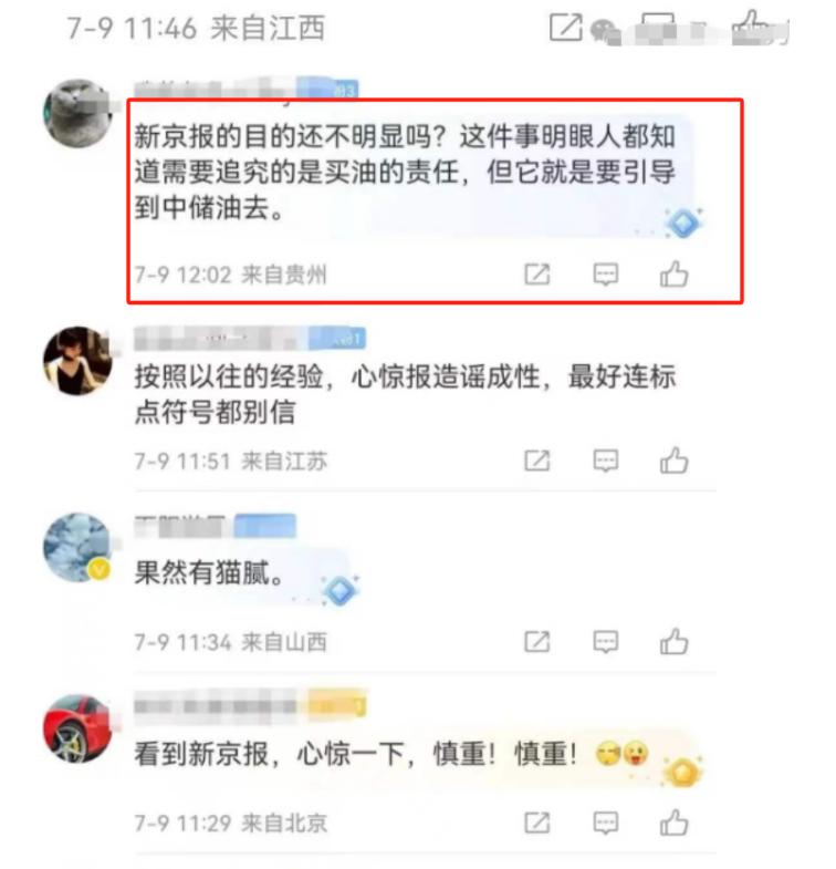 “新京報的目的還不夠明顯嗎?這件事明眼人都知道需要追究買油的責任,但是引導到了中儲油上去了。”