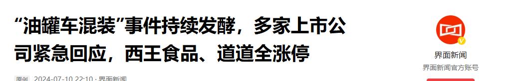 參考信源《“油罐車混裝”事件持續發酵,多家上市公司緊急回應,西王食品、道道全漲停》界面新聞