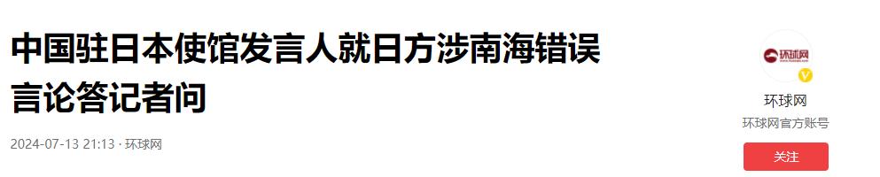 參考信源:《中國駐日本使館發言人就日方涉南海錯誤言論答記者問》2024-07-13 21:13·環球網