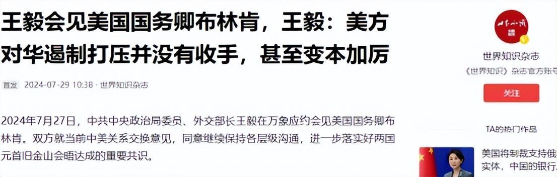 王毅會見美國國務卿布林肯,王毅:美方對華遏制打壓並沒有收手,甚至變本加厲首發2024-07-29 10:38·世界知識雜誌