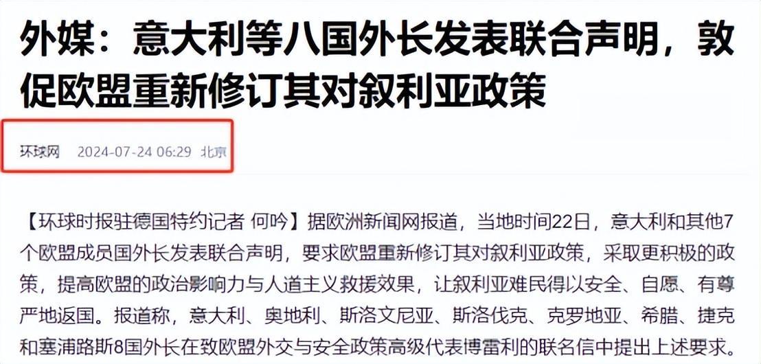 環球網2024年7月24日—外媒:意大利等八國外長髮表聯合聲明,敦促歐盟重新修訂其對敘利亞政策】