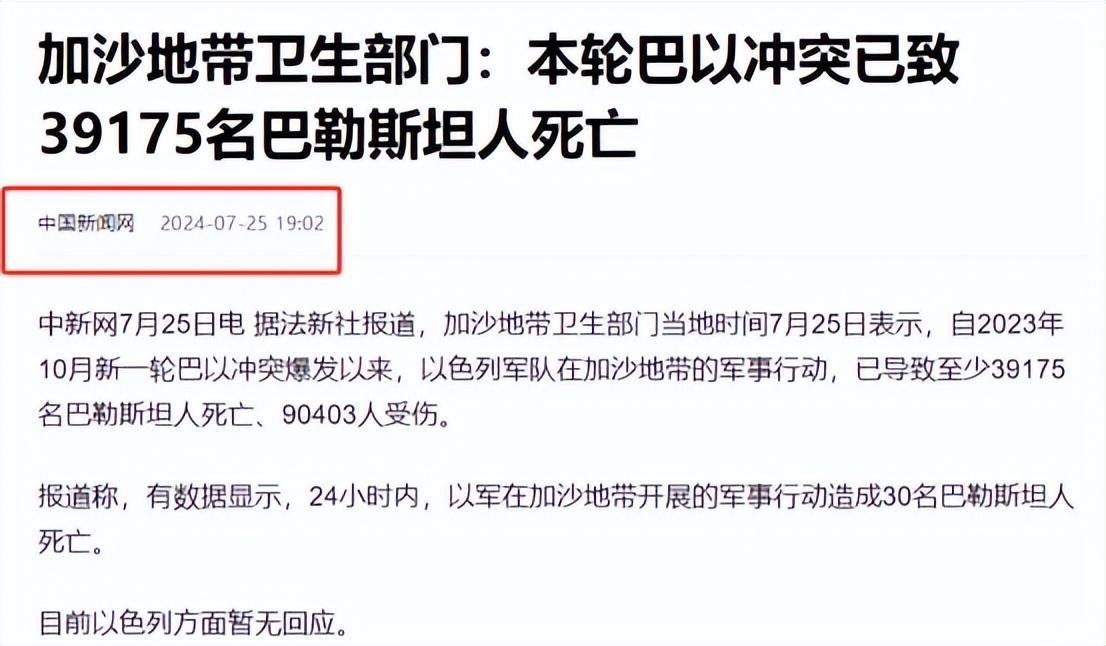 中國新聞網2024年7月25日—加沙地帶衛生部門:本輪巴以衝突已致39175名巴勒斯坦人死亡