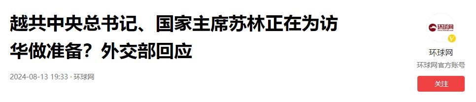 環球網 2024-08-13 19:33·“越共中央總書記、國家主席蘇林正在爲訪華做準備?外交部回應”