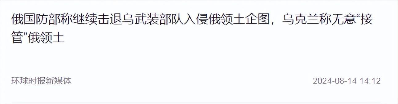 環球時報新媒體 2024-08-14 14:12“俄國防部稱繼續擊退烏武裝部隊入侵俄領土企圖,烏克蘭稱無意“接管”俄領土”