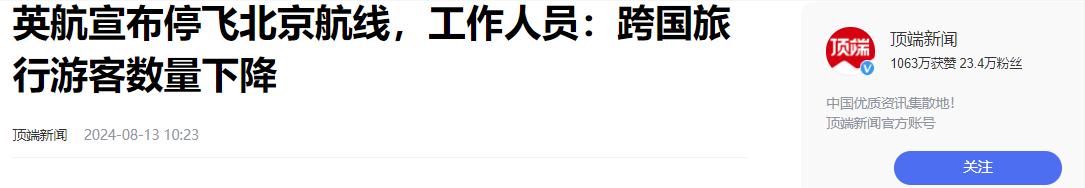 頂端新聞 2024.8.13.“英航宣佈停飛北京航線,工作人員:跨國旅行遊客數量下降”