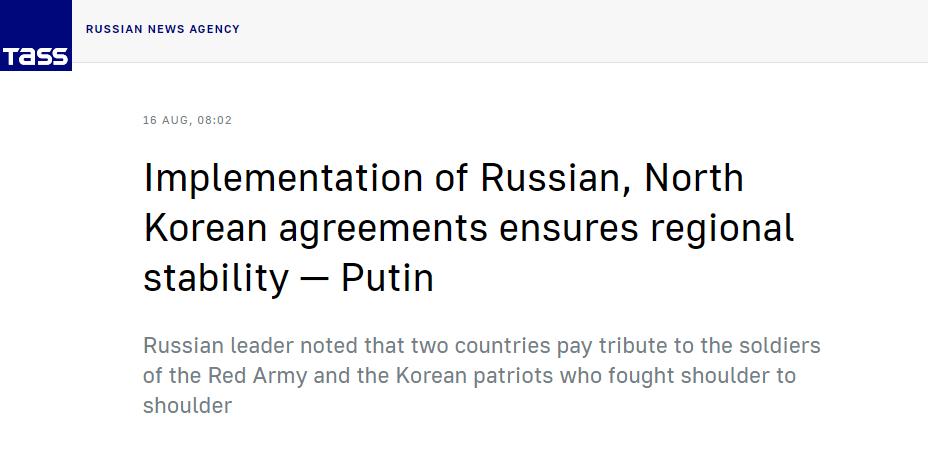 普京在今年五月左右和朝鮮領導人達成了一系列條約的結盟關係,雙方也在履行條約上做出了肯定的回覆,雙方要介於兩國的利益和兩國人民的安危爲主達成一系列的保護,要爲雙方地區和平做出大貢獻。