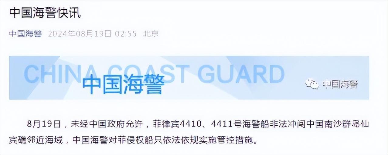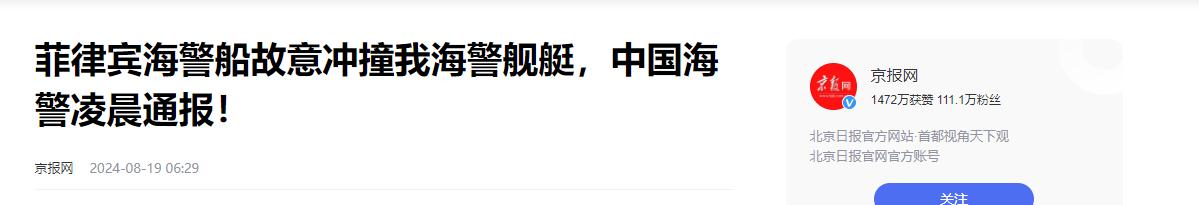 《菲律賓海警船故意衝撞我海警艦艇,中國海警凌晨通報!》京報網2024-08-19 06:29