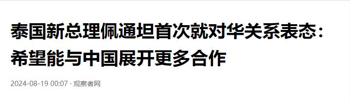 觀察者網 2024-08-19 00:07 “泰國新總理佩通坦首次就對華關係表態:希望能與中國展開更多合作”