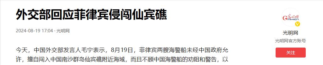 光明網 2024-08-19 17:04 “外交部回應菲律賓侵闖仙賓礁”