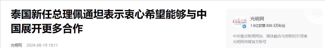 光明網2024.8.19“泰國新任總理佩通坦表示衷心希望能夠與中國展開更多合作”
